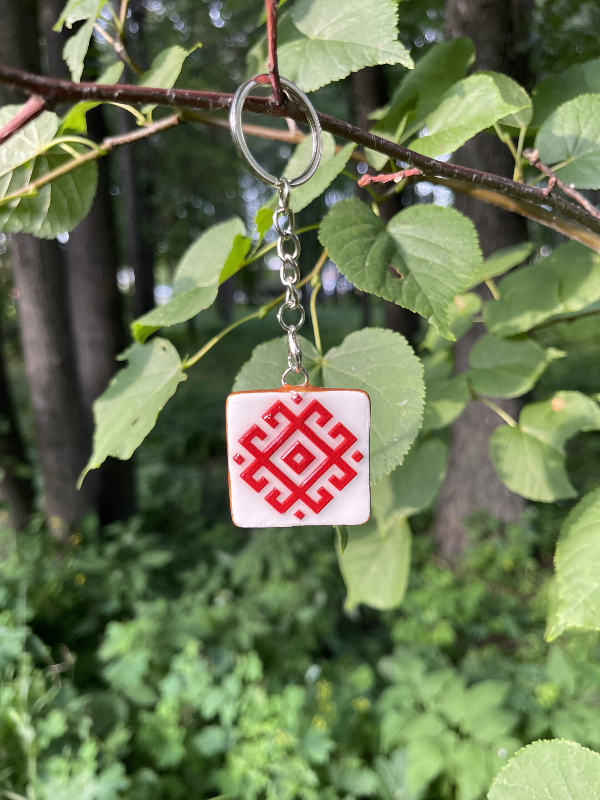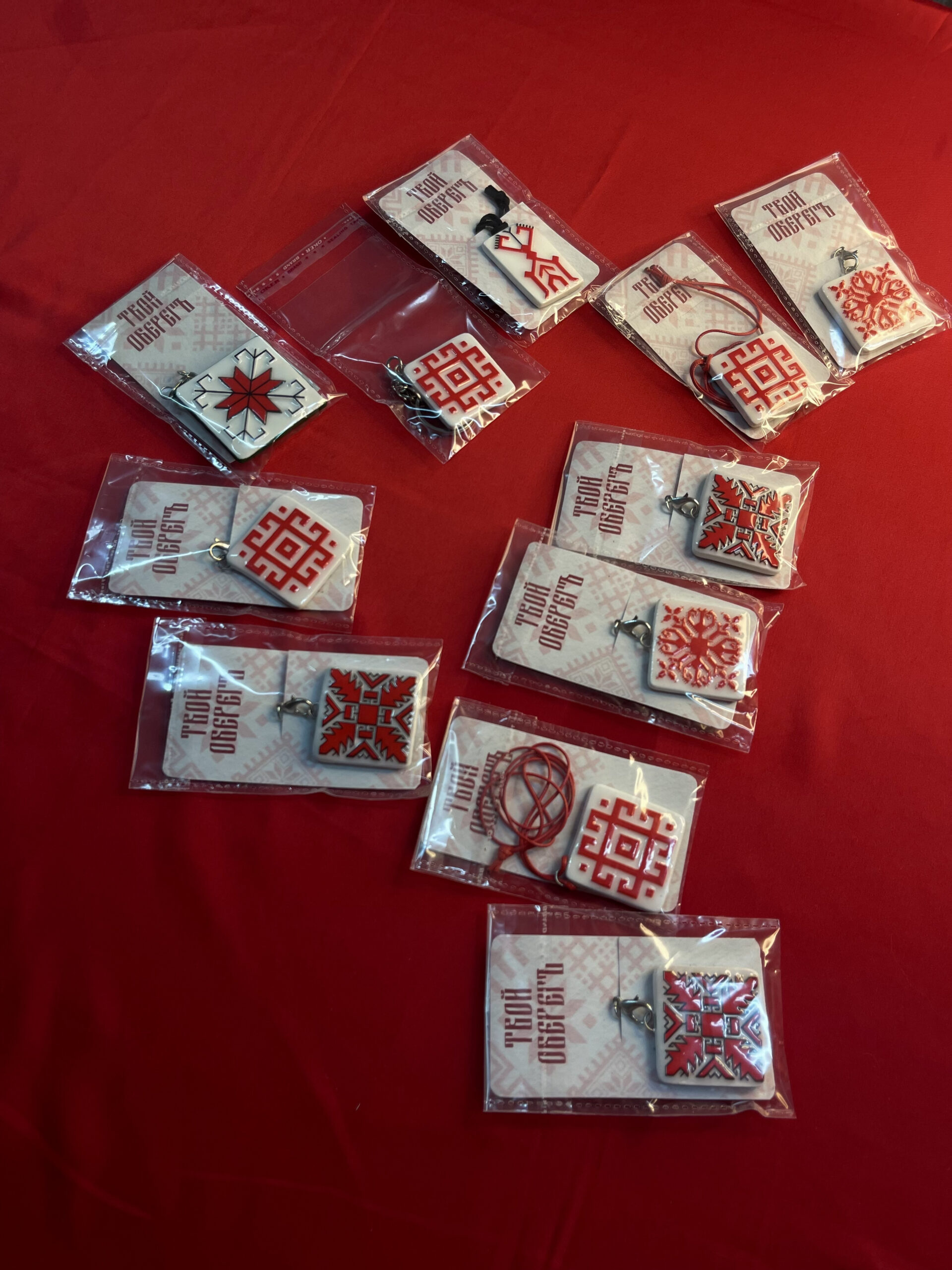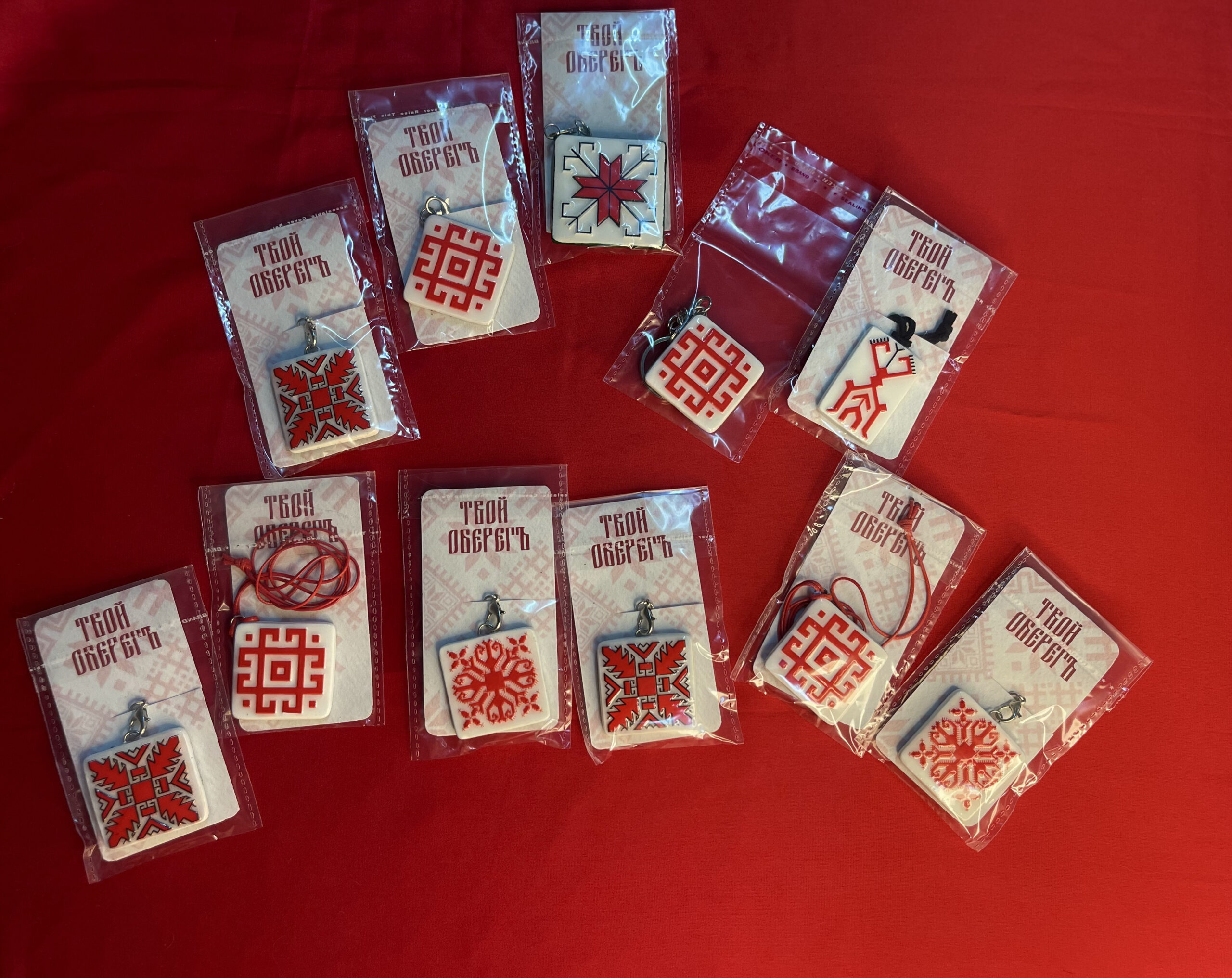 Брелоки на выборъ съ защитнымъ марийскимъ орнаментомъ ручной работы.